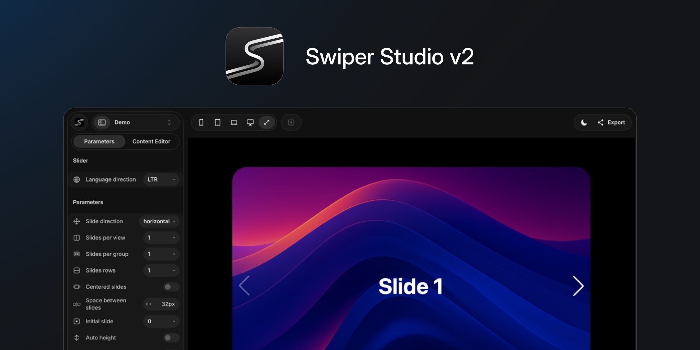 Swiper Studio just got its biggest update yet. Version 2 brings a redesigned editor, element animations, video support, responsive breakpoints, an MCP server for AI agents, Next.js export, and 25 ready-made use case templates. Here's what's new.